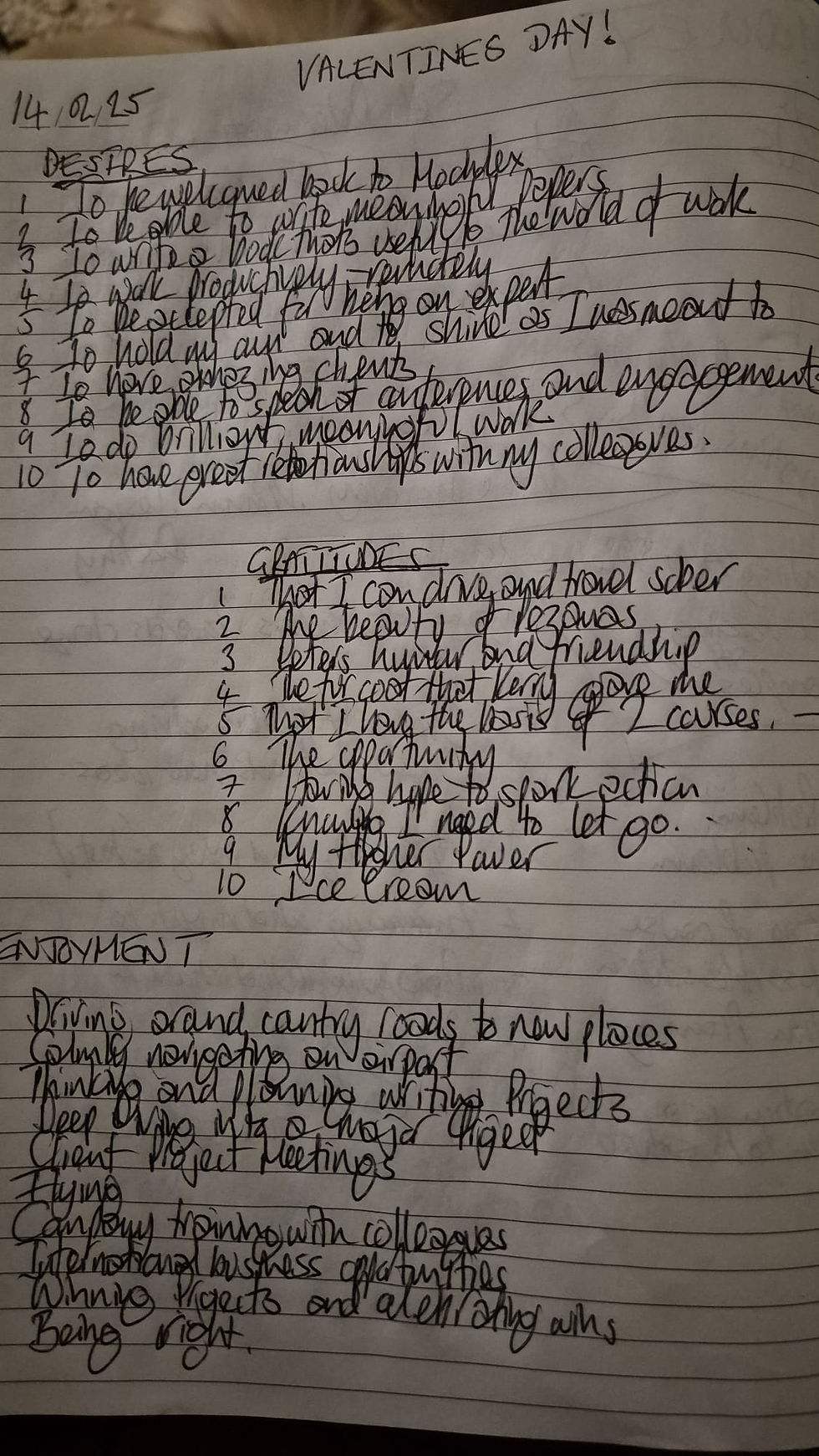 Look at my lists: My deepest Desire is for Stability and my greatest Enjoyment is Profound Peace. The two are not separate future goals; they are being generated right now by the disciplined practice of my Enjoyments and reinforced by my Gratitudes.